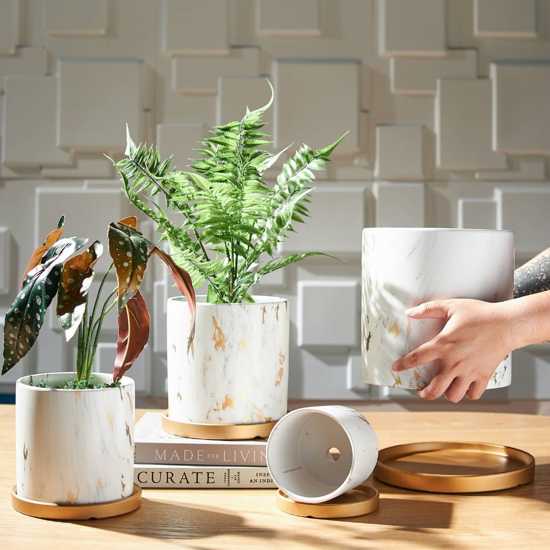 Contemporary marble print pots with gold base, showcasing modern elegance & style!